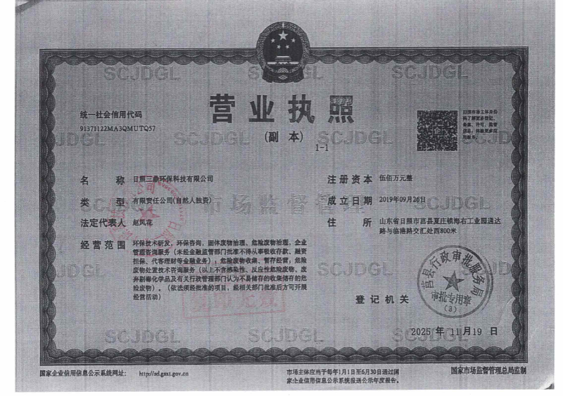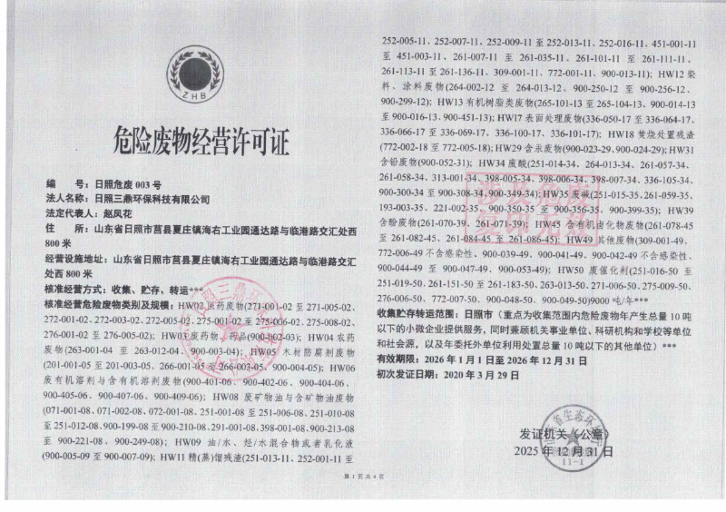 2020年3月29日取得山东省日照市环境保护局核发的危险废物经营许可证,经营许可证:日照危废003号。