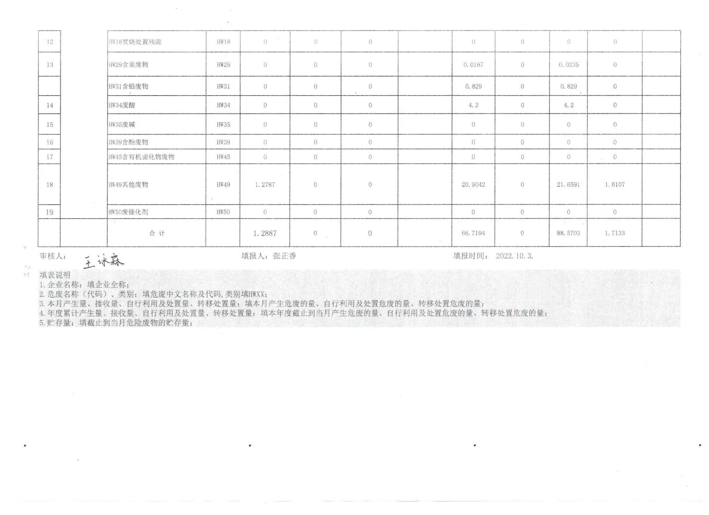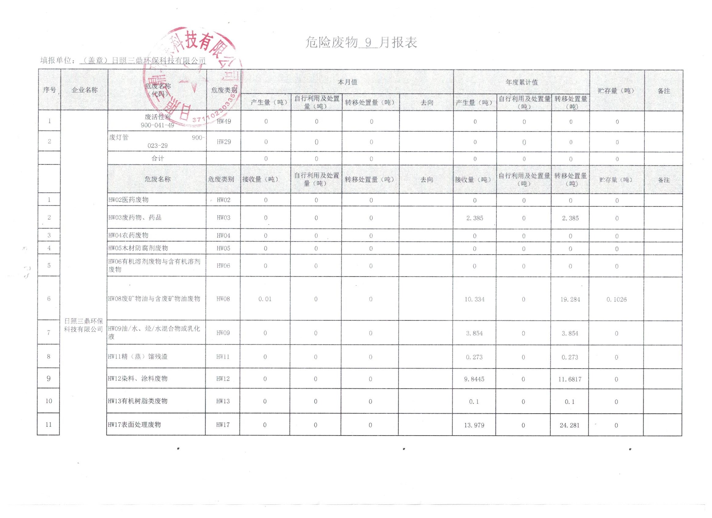 危险废物9月报表