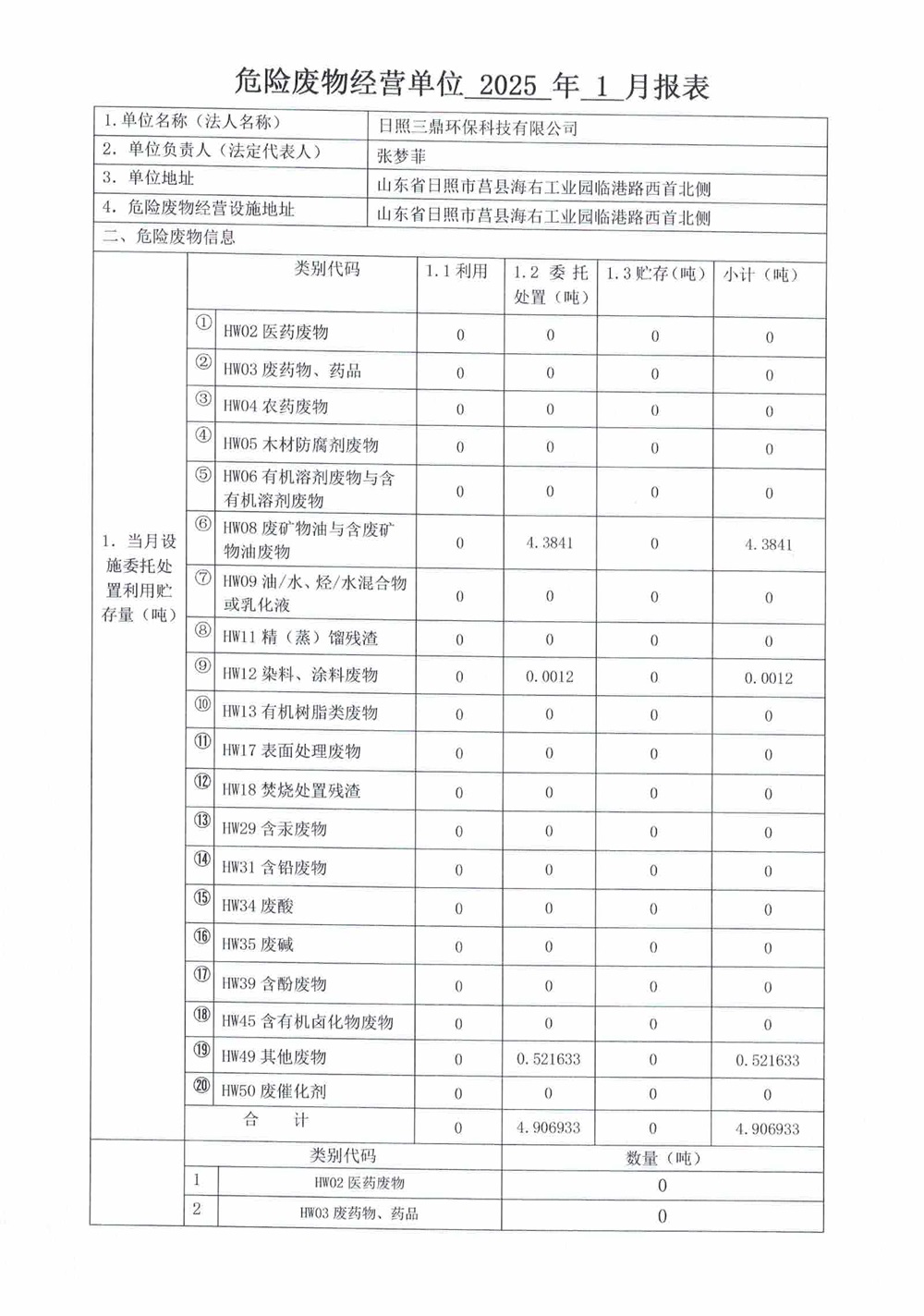 危险废物1月报表