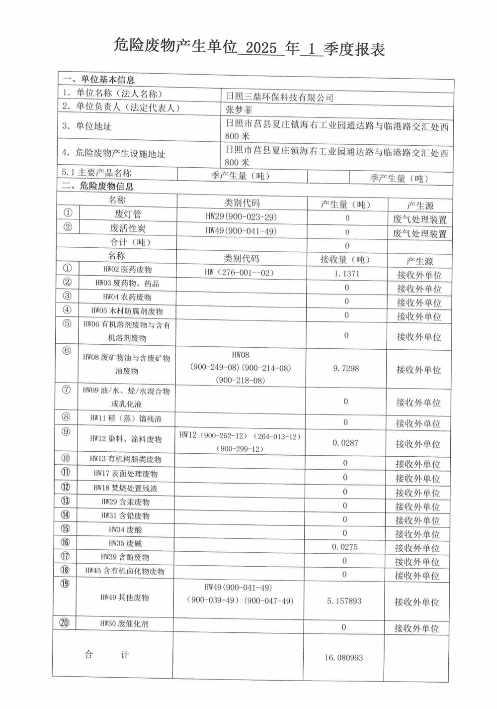 危险废物生产单位2025年1季度报表