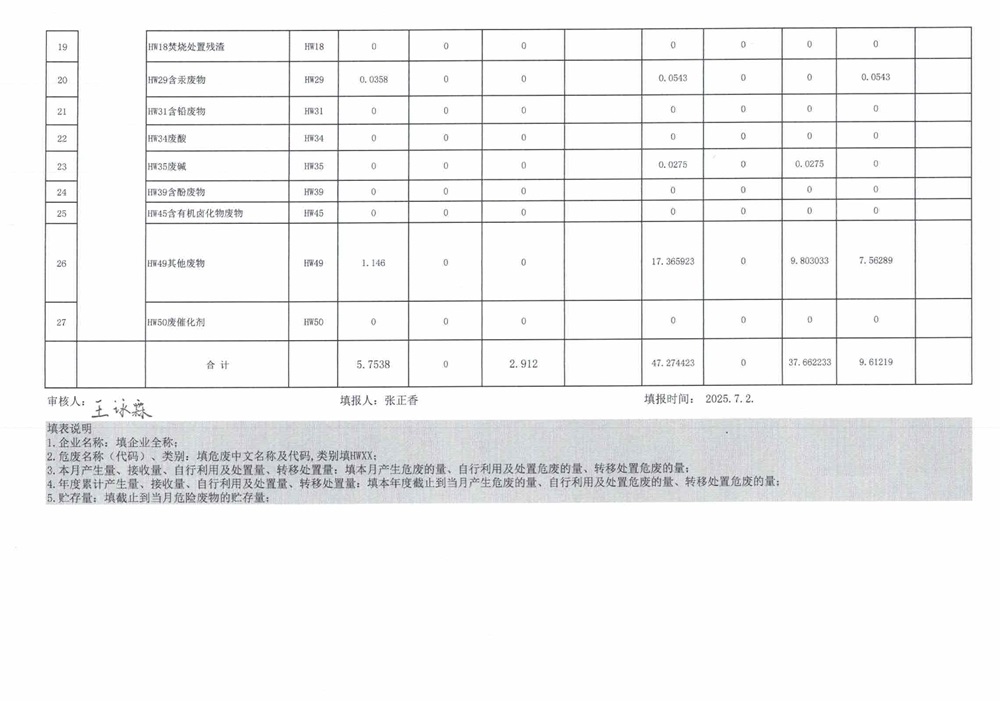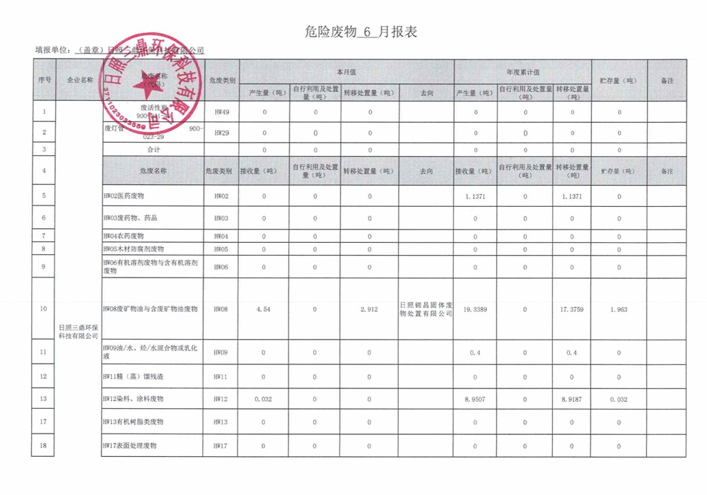 危险废物6月报表