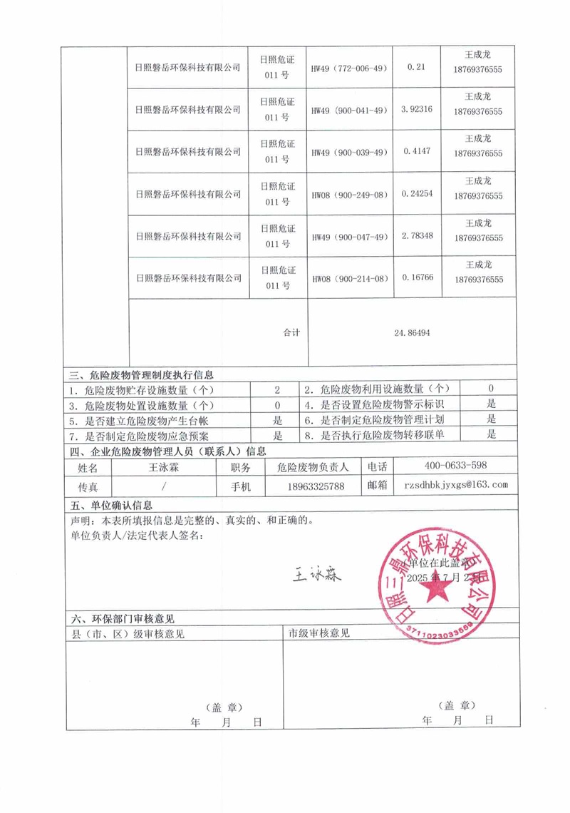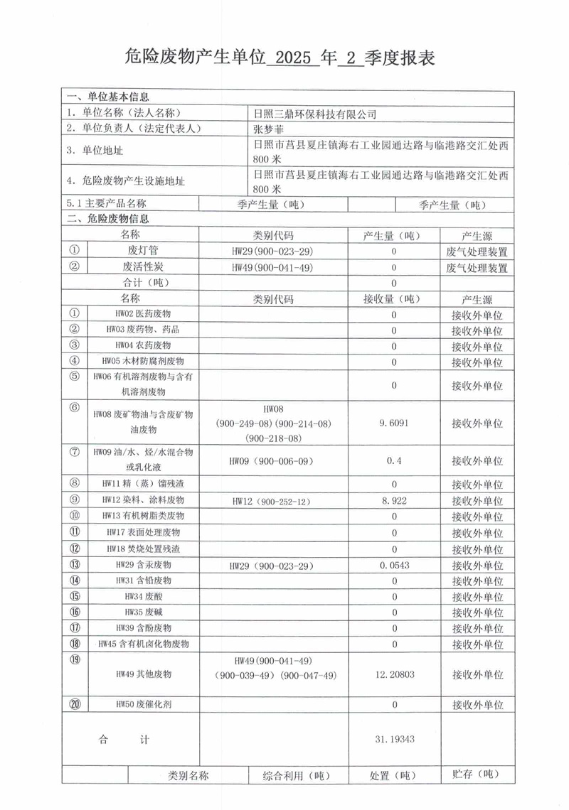 危险废物产生单位2025年2季度报表