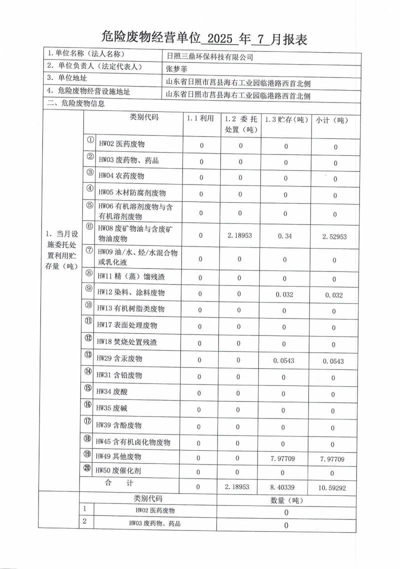 危险废物经营单位2025年7月报表