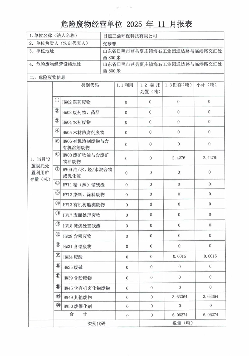 危险废物经营单位2025年11月报表